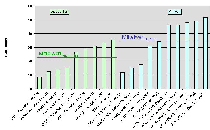 Abkürzungen: BEMT= Bis-Ethylhexyloxyphenol Methoxyphenol Methoxyphenyl Triazine BMDBM= Butyl Methoxydibenzoylmethane DBT = Dietyhlhexyl Butamido Triazone DTS = Drometrizole Trisiloxane EHMC = Ethylhexyl Methoxycinnamate EHT = Ethylhexyl Triazone HD = Hydrodispersion IMC = Isoamyl p-Methoxycinnamate MBC = Methylbenzylidene Camphor OC = Octocrylene SPBS = Sodium Phenylbenzimidazole Sulfonate TiO2 = Titanium Dioxide TDSA = Terephthalidene Dicamphor Sulfonic Acid ZnO = Zinc Oxide Bestimmung der UVA-Bilanz Die UVA-Schutzleistung wurde, wie in der DIN 67502 beschrieben, als UVA-Bilanz berechnet. Die Bestimmung der UVA-Bilanz beruht auf der Bestimmung des spektralen Transmissionsgrads τ(λ) einer Probe im Wellenlängenbereich 290 nm ≤ ? ≤ 400 nm. Hierzu wird ein Sonnenschutzmittel in einer Menge von 0.75 mg/cm2 gleichmäßig auf eine einseitig angeraute Plexiglas (PMMA)-Platte aufgetragen und mit einem geeigneten Spektralphotometer (LOT-ORIEL-INSTASPECII Komponentengerät) vermessen, das es durch die probennahe Anordnung einer räumlichen Integrationseinheit (z. B. Ulbrichtkugel, Diffusor) erlaubt, auch den diffusen Anteil der transmittierten Strahlung zu erfassen. Für jedes Produkt werden 3 Platten vorbereitet, auf denen 4 einzelne Messungen durchgeführt werden. Sofern die Absorption den Wert von 2 überschreitet, wird der Vorgang mit entsprechend verringertem Auftragsvolumen wiederholt (8). Mit dem spektralen Transmissionsgrad einer Probe im UV-Bereich (290 nm bis 400 nm) wird zunächst der in vitro Sonnenschutzfaktor SFin vitro, er errechnet (nach DIN 5031-10). Bei Ungleichheit zu dem auf der Packung angegebenen in vivo Sonnenschutzfaktor SFin vivo, er wird die Extinktionskurve über eine Konstante angepasst. Der resultierende Korrekturfaktor wird für die weiterführende Berechnung des in vitro PPD-Schutzfaktors SFin vitro, PPD, d. h. einem UVA-relevanten biologischen Endpunkt, herangezogen. Dabei wird das PPD (persistent pigment darkening)-Wirkungsspektrum (9) und die spektrale Bestrahlungsstärke Eλ(λ) einer Referenz-UVA-Strahlungsquelle benutzt (siehe Anhang A). Diese entspricht den Anforderungen für Strahlenquellen zur Bestimmung des in vivo PPD-Schutzfaktors SFin vivo, PPD nach dem japanischen Prüfverfahren (10). Auf Basis des in vivo Sonnenschutzfaktors SFin vivo, er und des SFin vitro, PPD wird die UVA-Bilanz berechnet, die das Verhältnis von UVA-Schutz zum ausgewiesenen Sonnenschutzfaktor SFin vivo, er kennzeichnet. Die UVA-Bilanz ist definiert durch: Ergebnis und Diskussion Auch bei der Untersuchung von Produkten mit höherem LIchtschutzfaktor lässt sich die neue DIN-Methode zur Bestimmung der UVA-Schutzleistungen uneingeschränkt und problemlos anwenden. Die Einzelergebnisse finden sich in Tab. 1 und Tab. 2 wieder. Die ermittelten UVA-Bilanzwerte variieren in einem Bereich von 6,1 bis 51,7. D.h., die Unterschiede sind bei Produkten mit höherem SPF noch stärker ausgeprägt, als bei den Produkten mit SPF 10 bis 12, die in den Vorjahren getestet wurden (6,7). Diese große Streubreite war allerdings vorherzusehen: Bei höherschützenden Produkten muss sich nahezu zwangsläufig eine ausgeprägter Unterschied ergeben, je nachdem, ob ein Produkt gerade eben den Australischen Standard erreicht oder ob es einen optimal ausgeglichenen UVA- und UVB-Schutz aufweist. Aufgrund der Erfahrung der Vorjahre wurden die ermittelten UVA-Bilanzwerte differenziert nach der Herkunft der Produkte, d.h. ob von forschenden Herstellern oder Discountern, betrachtet. In der Gruppe der Standardprodukte schnitten Sonnencremes, Lotions und Sprays von forschenden Herstellern im Mittel um 54 Prozent besser ab, als Discounterprodukte (Abb. 3). Den bestmöglichen UVA-Bilanzwert von 51,7 erreichte ein Markenprodukt. Dagegen kam das beste Sonnenschutzmittel in der Gruppe der Discounterware über einen UVA-Bilanzwert von 35,6 nicht hinaus.