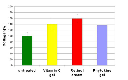 Das Ganzhautmodell kann für mindestens 4 Wochen im Air-Liquid-Interface weiterkultiviert werden. In dieser Zeit können Alterungsexperimente wie zum Beispiel UV-Bestrahlung durchgeführt werden oder aber auch topische Behandlungen zum Schutz oder zur Pflege der Haut. Der große Vorteil ist, dass diese Hautmodelle ein Stratum Corneum wie normale menschliche Haut enthalten. Die Wirkstoffe können daher unter realistischen Bedingungen in einer Creme- oder Gelgrundlage aufgetragen werden. Die Wirkstoffe dringen durch das Stratum Corneum in die Haut ein und entfalten dort ihre Wirksamkeit. Antiage-Wirkungen in der extrazellularen Matrix Collagen-Metabolismus Wesentliche Veränderungen betreffen die tieferen Hautschichten und hier vor allem die Dermis. Die biologische Ursache ist unter anderem in dem stark veränderten Collagenstoffwechsel zu finden. Die Collagene sind mengenmäßig mit ca. 60% der Trockenmasse der Hauptbestandteil der Haut (7). Unter den Collagen wiederum ist Collagen Typ I mit 70-80% das häufigste (8). Vergleicht man als Maß für die Syntheseaktivität die m-RNA der Fibroblasten einer jungen Alterskohorte mit der einer alten, so stellt man für zum Beispiel Procollagen Typ I eine Abnahme der Syntheseaktivität von ca. 60% fest (9). Darüberhinaus steigt die Syntheserate für Collagenasen an (9). Es wird im Alter also nicht nur weniger Collagen hergestellt, sondern dieses wenige Collagen auch stärker abgebaut. Beide Effekte zusammen führen dazu, dass der Collagengehalt im Schnitt um 1% pro Lebensjahr abnimmt (10). Die Folge ist Abnahme der Zugfestigkeit der Haut und das Auftreten von Falten. Ein wesentliches Ziel eines Antiage-Kosmetikums ist es daher, die Collagensynthese der Fibroblasten zu stimulieren. In den letzten Jahren wurden eine Reihe von Wirkstoffen identifiziert, die an verschiedenen Stellen stimulierend in den Collagenstoffwechsel eingreifen. Ascorbinsäure (Vitamin C) ist ein Cofaktor für die Enzyme Lysylhydroxylase und Prolylhydroxylase, die beide essentiell für die Collagenbiosynthese sind. Im Hautmodell wurde aus diesem Grund in unseren Untersuchungen Vitamin C als Positivkontrolle gewählt. Die viermalige topische Anwendung eines Vitamin C-haltigen Gels (50 mg/l Ascorbinsäure) führte innerhalb von 10 Tagen zu einer Steigerung der Gesamt-Collagenproduktion um 40% im Vergleich zur unbehandelten Kontrolle. Für stabilisiertes Retinol, als 0,024%ige kommerzielle Creme über 10 Tage viermal angewendet, wurde eine Steigerung der Collagensynthese um 59% gefunden (5). Retinol wirkt damit ähnlich stimulierend wie Retinsäure, deren Wirksamkeit in mehreren Studien sowohl in vitro (11) als auch in vivo (9,12) nachgewiesen worden ist. Im Unterschied zu Retinsäure ist Retinol wesentlich weniger hautirritierend (13) und führte in verkapselter Form in der eingesetzten kosmetischen Creme zu keiner Hautirritation. Retinoide sind - im Unterschied zu Vitamin C - nicht direkt an der Collagensynthese beteiligt. Vielmehr wirken sie als Botenstoffe, die den Fibroblasten veranlassen, das Syntheseprogramm für Collagen zu starten (14). Interessanterweise sind auch manche aus Pflanzen gewonnen Extrakte in der Lage, diese cytokinartige Wirkung zu entfalten (15). So führt Phytokine , ein Sojapeptid, nach 2-wöchiger topischer Anwendung aus einer 10%igen Gelformulierung zu eine Steigerung der Collagensynthese um 37% (16). Abgebautes Collagen kann so in der gealterten Haut ersetzt werden, wie in einer in vivo Studie gezeigt werden konnte (16). In Abb. 3 sind die Ergebnisse zusammenfassend dargestellt. Abb. 3: Stimulierung der Collagensynthese durch ein 0,005%iges Vitamin C-Gel , eine kommerziell erhältliche Retinolcreme (0,024% Retinol) und ein 10%iges Phytokine -Gel im Ganzhautmodell (Mittelwerte SD aus (5) und (16) zusammengestellt).