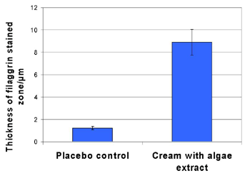 Antiage-Wirkungen auf die Keratinocytendifferenzierung Der Alterungsprozess wirkt sich in der Epidermis vor allem als Verlangsamung des Keratinocytenstoffwechsels und der Keratinocytenproliferation aus (2,21). Die Hautdicke nimmt alle 10 Jahre um ca. 6% ab, wovon auch die Epidermis betroffen ist (1,23). Damit einhergehend sinkt auch der Gehalt an wichtigen Matrixbestandteilen der Epidermis. Hier ist vor allem Filaggrin und die damit zusammenhängenden Verbindungen zu nennen, die im Verlauf der Keratinocytendifferenzierung verschiedene wichtige Funktionen übernehmen. Filaggrin (filament aggregating protein) entsteht aus seinem hochmolekularen Vorläufer Profilaggrin in den tieferen Schichten des Stratum corneums. Nachdem sich ein Filaggrin-Keratin-Komplex gebildet hat, katalysiert Filaggrin die Disulfidbrückenbildung zwischen den Keratinsträngen. Ein stabiles Keratinnetzwerk ist - unter anderem - wichtig für die Barrierefunktion des Stratum Corneums. Nachdem es diese Aufgabe erfüllt hat, wird Filaggrin proteolysiert und metabolisiert, bis seine Bestandteile schließlich den natürlichen Feuchthaltefaktor der Haut (natural moisturizing factor NMF) bilden. Auf diese Weise wird Wasser im Stratum Corneum gehalten und die Haut vor Austrocknung geschützt (24). In trockener, schuppiger Haut, wie man sie häufig bei Atopikern oder bei älteren Personen am Unterschenkel findet, ist der Filaggringehalt reduziert. Im Vergleich von unter 20-Jährigen mit über 60-Jährigen wurde eine Abnahme um 41% am Unterschenkel gefunden, parallel zum klinischen Auftreten trockener Haut (25). Zur Stimulierung der Filaggrinsynthese hat sich ein Algenextrakt aus Spirulina bewährt (26), der aus 1%iger Creme im Hautmodell zu einer Zunahme der Filaggrin-haltigen Zone in der Epidermis von 1 auf 8,5 µm führte (Abb. 7). Abb. 7: Dicke der Filaggrin-haltigen Zone im Ganzhautmodell nach viermaliger Behandlung mit 1%iger Spirulina-Extrakt-haltiger Creme über 10 Tage (Mittelwert SD).