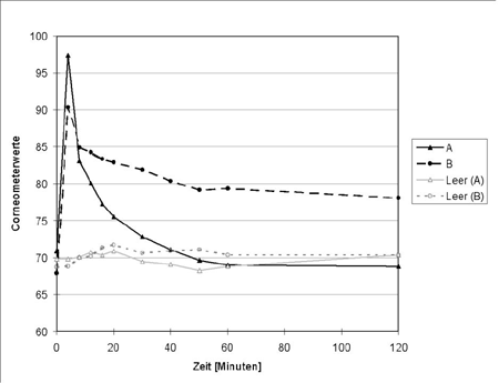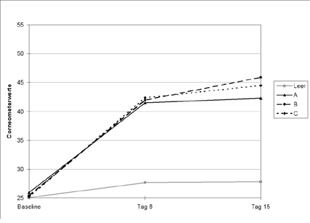 Demgegenüber kann der Langzeiteffekt eines Präparates, der die Veränderung des Hautzustandes nach wiederholter Applikation darstellt, frühestens 12 Stunden nach der letzten Applikation bestimmt werden. Abbildung 2 (unten) zeigt einen solchen Langzeiteffekt nach zwei Wochen Behandlung. Indem nach Ende der Behandlung die Messungen weitergeführt werden, kann zudem der persistierende Effekt einer Behandlung erfasst werden. Gerade bei der Behandlung von chronisch-inflammatorischen Krankheiten mit einem erhöhten epidermalen "turnover" kann diese Fragestellung besonders interessant sein. Abbildung 2: Langzeiteffekt der Hautfeuchtigkeit A, B, C = Behandlung mit Präparat A, B, C Leer = Unbehandeltes Kontrollfeld