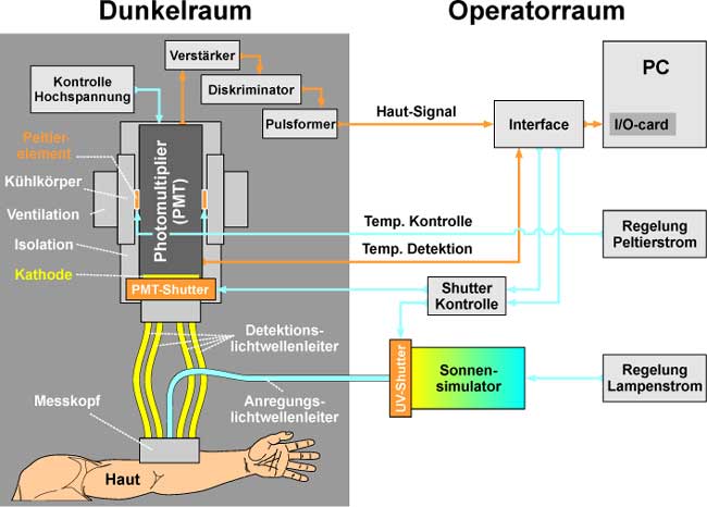 Autorenbeitrag A. Schrader*, S. Benard und M. Rohr Rationale und Praxis der Biophotonik * Institut Dr. Schrader - Creachem GmbH, Holzminden Vortrag anlässlich des GD-Symposiums "Wirkungen von Dermokosmetika" in Düsseldorf am 17. Oktober 2001 Synopsis Der Schutz der menschlichen Haut vor negativen Auswirkungen der Sonnenstrahlen bleibt bis heute eine Herausforderung für die pharmazeutische und kosmetische Industrie. Deshalb sind neue Strategien zur Testung der Schutzleistung kosmetischer Formulierungen von größtem Interesse. Ziel dieser Arbeit ist die in vivo Bestimmung der UVA-Schutzleistung chemischer Filter und Antioxidantien in komplexen Formulierungen mittels ICL-S (Induced Chemiluminescence of Human Skin). Diese Methode realisiert die unmittelbare Umsetzung von Prinzipien der Biophotonikforschung in die Praxis und ermöglicht, unter Ausnutzung der Photonenemission der menschlichen Haut, eine in vivo Quantifizierung der Belastung unmittelbar nach Sonnenexposition. UVA-Strahlung (320 - 400 nm) führt zu einer verstärkten Bildung freier Radikale und reaktiver Sauerstoffverbindungen in den Zellen. Dieser "oxidative Stress" kann elementare Bausteine der Zellen wie DNA, Proteine und Lipide schädigen und zu vorzeitiger Hautalterung (sun aging) und Hautkrebs führen. Ein Teil der Energie dieser exergon ablaufenden Reaktionen wird in Form von Photonen freigesetzt. Diese UV-induzierte aber chemisch generierte Photonenemission (Chemolumineszenz) korreliert mit dem Ausmaß der Schädigung und verbindet damit einen realitätsnahen stress-inducer (UVA-Strahlung) mit biochemischen und biophysikalischen Auswirkungen auf Zellniveau. Durch hochempfindliche Photomultiplier und die single-photon-counting Technik wird die messtechnische Erfassung der ICL-S realisiert. Die in Probandenstudien ermittelten Werte zeigen eine Reduktion der Photonenemission von bis zu 70 % bei einer eingesetzten Konzentration chemischer UVA-Filter von 2 % im Vergleich zur unbehandelten Haut. Die Wirksamkeit der eingesetzten Antioxidantien zeigt sich in einer Verminderung der Photonenemission von nahezu 20 % nach zweiwöchiger regelmäßiger Produktapplikation im Vergleich zum Ausgangswert. Einleitung Seit jeher übt das enzymkatalysierte Organismenleuchten (Biolumineszenz) oder das Himmelsschauspiel der Aurora borealis (Chemolumineszenz) auf den Menschen eine magische Faszination aus. Die rationale und wissenschaftlich korrekte Herangehensweise an Photonenemissionsvorgänge mit Hilfe hochempfindlicher Photomultiplier eröffnet jedoch nicht minder faszinierende Aussichten. Die Biophotonik wird selbst in den Handlungsempfehlungen der Agenda der Bundesregierung "Optische Technologien für das 21. Jahrhundert" als prioritäres Themenfeld herausgestellt. Ultraviolette Strahlung sowie kurzwellige, sichtbare Strahlung rufen nach Einwirkung auf Oberflächenareale lebender Organismen zeitverzögert ein Chemolumineszenzsignal hervor [1, 2]. Die Natur so gearteter photoinduzierter Emissionen ist bis zum heutigen Tag Gegenstand der Forschung. Die genaue Äthiologie der gemessenen Chemolumineszenz ist für ein komplexes Organ wie die Haut schwer zu ermitteln. Es wird vielmehr der Endpunkt einer Kaskade von Reaktionen gemessen, die durch mehrere Emissionsprozesse und Absorptionsprozesse charakterisiert sind. Eine Beeinflussung der gemessenen Signale ist dagegen gut durchführbar. Vor allem nach UVA-Bestrahlung wird in Zellen ein oxidativer Stress erzeugt der das steady state Gleichgewicht (oxidative Homöostase) zwischen oxidativen Prozessen und Systemen des anti-oxidativen Schutzes empfindlich stört [3]. Durch die vermehrte Bildung von freien Radikalen und reaktiven Sauerstoffverbindungen (ROS), vor allem von Superoxidanionradikalen (O2-) und Wasserstoffperoxid (H2O2) werden elementare Zellbausteine verändert und dadurch in ihrer Funktion gestört. Von O2- und H2O2 leiten sich zusammen mit Metallionen, Peroxidasen oder Stickstoffmonoxid weitere reaktive Spezies ab. Ein besonders ausgeprägtes gewebeschädigendes Potential weisen Hydroxyl-Radikale (OH), Peroxynitrit, Singulett-Sauerstoff, Hypochlorsäure und der Komplex I von Peroxidasen auf. Die Absorption der Strahlung durch biologisch relevante Moleküle, wie z.B. Hämverbindungen, Flavine ist dabei das auslösende Primärereignis. Nach Initiierung dieser primären oxidativen Prozesse werden vor allem Reaktionen von ROS mit ungesättigten Fettsäuren, Kernsäuren und Proteinen beschrieben. Die Häufigkeit der chronischen Strahlungsschäden der Haut hat in den letzten Jahren massiv zugenommen. Neben der akuten Schädigung der Haut durch den Sonnenbrand für den vor allem der UVB-Anteil des Sonnenspektrums verantwortlich ist, wird die UVA-Strahlung (320 - 400 nm) für Langzeitschäden, wie vorzeitige Hautalterung (sun-aging), Immunsuppression und Hautkrebs verantwortlich gemacht [4]. Durch UVB-Filter in kosmetischen Formulierungen wird das Frühwarnsignal der Haut (der Sonnenbrand) nicht oder erst nach längeren Bestrahlungszeiten aktiv und damit die UVA-Exposition der Haut noch verstärkt. Damit wird die UVA-Strahlung mit zu einem dominierenden Stressfaktor der Haut, vor allem nach ausgiebiger Sonnenexposition. Um eine optimale Wirkung eines Sonnenschutzproduktes zu erreichen, sollten die negativen Auswirkungen vor denen eine Wirksubstanz die Haut schützen soll, möglichst umfassend quantitativ in vivo beschrieben werden. Eine in vivo Detektion der emittierten Photonen gewährleistet die Verknüpfung eines realitätsnahen stress-inducers (UVA Strahlung) mit einer umfassenden Zellantwort und bildet somit die Basis für eine optimierte Produktentwicklung.