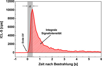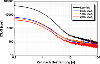 Werden die integralen Zählraten des Leerfeldes zu den Produktfeldern ins Verhältnis gesetzt, erhält man Größen-unabhängige Quotienten von 3 bzw. 2 für die Rezepturen UVB1 und UVB2 sowie einen Wert von 14 für die Rezepturen UVB1+UVA1 und UVB2+UVA1. Die Werte für das mit Placebo behandelte Hautareal liegen in der gleichen Größenordnung (ca. 2.5) wie die Messwerte der mit UVB-Filter behandelten Hautflächen. Die in vivo erzielten Resultate zeigen, dass mittels ICL-S unabhängig von den aktuellen UVB-Schutzeigenschaften eines Produktes dessen UVA-Schutz bestimmt werden kann. Zur Verifizierung dieses Ergebnisses wird eine Konzentrationsreihe eines weiteren Filters mit guten UVA-Absorptionseigenschaften getestet. Auf drei Testarealen werden 0.5, 1.0 und 2.0 % von UVA2 eingesetzt. Auf drei weiteren Testarealen werden diesen Formulierungen noch chemische UVB-Filter zugesetzt (vgl. Tab. 1). Um den Einfluss der reinen Grundlage auf die gemessenen Signalintensitäten zu testen kommt zusätzlich ein Placebo ohne jeglichen Filter zum Einsatz. Abb. 5 zeigt die Abklingkinetiken unmittelbar nach UVA-Bestrahlung der Haut in doppelt logarithmischer Darstellung. Es ist zu erkennen, dass das unbehandelte Messareal die höchsten Signalintensitäten zeigt. Weiterhin ist eine kontinuierliche Abnahme der Signalintensitäten mit Erhöhung der UVA-Filterkonzentration offensichtlich. Schon 100 s nach Applikation der UV-Noxe ist der Grundpegel des gemessenen ICL-S-Signals wieder erreicht.