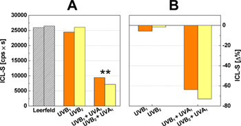 Eine Normierung der Werte auf Leerfeld und Placebo ergibt eine Abnahme der integralen ICL-S von ca. 60 % ungeachtet der Tatsache eines zusätzlichen UVB-Schutzes von SPF 7 im Vergleichsprodukt (vgl. Abb. 6).