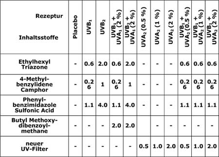 Material und Methoden: Modellformulierungen In den gezeigten Untersuchungen finden zwei verschiedene Filtersysteme (UVA1, UVA2) Verwendung, die in unterschiedlichen Konzentrationen in O/W-Emulsionen eingesetzt werden. Die Formulierungen werden nach den klassischen Verfahren hergestellt wie bereits unter [5] beschrieben. Neben den eingesetzten UVA-wirksamen Filtern werden zum Vergleich auch UVB-Filter eingesetzt. Eine Übersicht der Wirksubstanzen und deren Konzentrationen ist in Tab. 1 gegeben. Zusätzlich werden Modellformulierungen mit Antioxidantien in unterschiedlicher Kombination und Verkapselung eingesetzt. Tocopheryl Acetate wird in einer Konzentration von 3 %, Tocopherol (verkapselt) in einer Konzentration von 0.3 % verwendet. Als Kontrolle dient ein in der Literatur beschriebener Antioxidantien-Mix aus 1.0 % Tocopheryl Acetate, 0.25 % Rutin und 0.125 % Ferulic Acid [6].