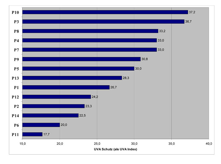 Abkürzungen: BEMT= Bis-Ethylhexyloxyphenol Methoxyphenol Methoxyphenyl Triazine BMDBM= Butyl Methoxydibenzoylmethane DBT = Dietyhlhexyl Butamido Triazone EHMC = Ethylhexyl Methoxycinnamate EHT = Ethylhexyl Triazone HD = Hydrodispersion IMC = Isoamyl p-Methoxycinnamate MBBT = Methylene Bis-Benzotriazolyl Tetramethylbutylphenol 4-MBC = 4-Methylbenzylidene Camphor OC = Octocrylene OS = Octyl Salicylate PBSA = Phenyl benzimidazole Sulfonic Acid/ SPBS = Sodium Phenylbenzimidazole Sulfonate TiO2 = Titanium Dioxide ZnO = Zinc Oxide Ergebnis und Diskussion Die Methode erwies sich als sehr gut anwendbar auf alle Testprodukte. Mittels der Methode ließ sich die UVA-Schutzleistung der einzelnen Produkte problemlos ermitteln. Wie aus Abbildung 1 hervorgeht, reicht die Skala der UVA-Schutzleistungen - angegeben als UVA-Index - von 17 bis 37. Dies ermöglicht eine klare Differenzierung zwischen den einzelnen Produkten. Einzelne Wiederholungsmessungen ergaben zudem eine sehr gute Reproduzierbarkeit und bestätigen damit das Ergebnis einer Studie, bei der mit anderen Produkten eine gute Übereinstimmung zwischen mehreren Prüfinstituten gezeigt werden konnte [5]. Da das Prozedere sich durch seine einfache und schnelle Ausführung auszeichnet, ist es unseres Erachtens nach hervorragend zur Qualitätsbeurteilung von Sonnenschutzprodukten geeignet. Abbildung 1: Gegenüberstellung der UVA Schutzleistung verschiedener Sonnenschutzprodukte Bei der Beurteilung der UVA-Schutzleistung der getesteten Sonnenschutzprodukte fällt auf, dass trotz fast gleichlautender Auslobung des UVA-Schutzes (gemäß Australischem Standard) erstaunlich große Unterschiede in den gemessenen Schutzleistungen auftraten. Interessanterweise werden die Produkte mit den höchsten UVA-Schutzleistungen von Herstellern angeboten, die sich seit Jahren intensiv in Forschung und Entwicklung mit dem Thema Sonnenschutz auseinandersetzen. Demgegenüber finden sich in der Gruppe der wenig schützenden Produkte vermehrt Discounterprodukte, wobei insbesondere ein Produkt negativ hervortrat. Die hier ermittelten Werte lassen die Auslobung der Australischen Norm sogar als zweifelhaft erscheinen. Zusammenfassung Die Bestimmung des UVA-Index als Maß für den UVA-Schutz von Sonnenschutzmitteln hat sich in der vorliegenden Studie bewährt. Alle Testprodukte konnten bei geringer Schwankung der Einzelwerte klar differenziert werden. Dabei traten erstaunlich große Unterschiede in der absoluten Leistung der Produkte auf. Die Methode lässt sich einfach und schnell anwenden und bietet somit alle Voraussetzungen für eine effiziente Produktdifferenzierung im UVA-Schutz. Ferner eignet sich diese in vitro Methode ideal als Screeningmethode, um Formulierungen für den dermokosmetischen Sonnenschutz effektiv zu optimieren. Literatur [1] S. Koopmann, J. Schulz, H. Gers-Barlag, F. Pflücker, R. Daniels; Investigations on the stability of Pickering-emulsions using surface modified nanometer-sized titanium dioxides. Proc. 3rd World Meeting on Emulsion, Lyon (2002) [2] Leitlinie Dermokosmetischer Sonnenschutz der GD Gesellschaft für Dermopharmazie (2003); www.gd-online.de [3] Australian Standard AS 2604 (1993) [4] V. Wendel, E. Klette and H. Gers-Barlag; A new in vitro test method to assess the UVA protection performance of sun care products; SÖFW-Journal 127,12-30 (2001) [5] H. Gers-Barlag, V. Wendel, E. Klette, R. Bimczok, C. Springob, P. Finkel, T. Rudolph, H.U. Gonzenbach, H. Westenfelder, P. Schneider, D. Kockott, U. Heinrich, H. Tronnier, W. Johncock, R. Langner, H. Driller, F. Pflücker, T. Wünsch; The reproducibility of an in vitro determination of the UVA INDEX describing the relative UVA protection of sun care products; IFSCC Magazine 5 (3), 161 - 166 (2001) [6] E. Klette, V. Wendel , K.P. Wittern and H. Gers-Barlag; A quick, practical test procedure to evaluate the performance of instruments used for in vitro UV protection measurements; Int J Cos Sci 24 (6), 323-329 (2002) Autor