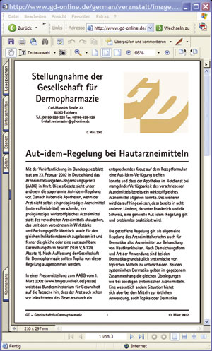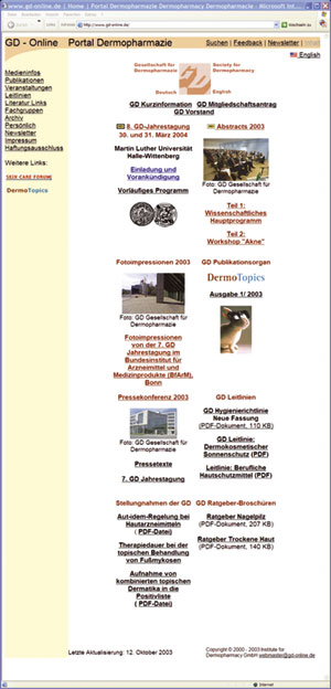 Die drei verbundenen Homepages werden inzwischen alle sehr häufig besucht. Von internationalen Suchmaschinen wie Google, Yahoo oder Alltheweb werden sie fast immer unter den ersten Stellen gelistet. Ein praktischer Test mit den Begriffen „dermopharmacy“ oder „dermopharmazie“ wird diese Aussage unterstützen. Über die genannten Suchmaschinen sind dann auch alle Unterseiten der im Portal verlinkten Homepages einfach und sicher zu erreichen. GD-Homepage: www.gd-online.de Die GD-Homepage ist seit dem Start im Jahr 1998 inzwischen zu einer großen Bibliothek angewachsen, unter der mehr als 3.000 DIN A 4-Seiten in Deutsch und teilweise in Englisch sowie über 1.400 Fotos und Abbildungen hinterlegt wurden. Im monatlichen Durchschnitt werden zur Zeit mehr als 3.000 Besucher (IP-Adressen) und über 13.000 Artikelabrufe registriert. Die Startseite der Homepage vermittelt einen guten Überblick über die vielfältigen Inhalte, die auf Unterseiten archiviert sind. Ständig geführt werden die Rubriken Medieninfos, Publikationen, Veranstaltungen, Leitlinien, Literaturlinks, Fachgruppen, Persönlich und Archiv. Unter der Rubrik Medieninfos lassen sich zum Beispiel die im Laufe der Jahre sehr zahlreich gewordenen Pressetexte und Pressefotos der GD aufrufen. Unter der Rubrik Veranstaltungen sind die wissenschaftlichen Programme aller Tagungen und Symposien der GD sowie Zusammenfassungen der bei diesen Veranstaltungen gehaltenen Vorträge hinterlegt. Die Rubrik Literaturlinks führt zu Online-Publikationen von GD-Mitgliedern, die Rubrik Persönlich zum Vorstand, zu einem Verzeichnis der fördernden Mitglieder und zur Satzung der GD.