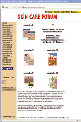 Den Lesern der Druckausgabe bieten die Online-Versionen den zusätzlichen Nutzen eines schnellen elektronischen Archivs, das zur Recherche herangezogen werden kann. Ergänzend zu den im Druckwerk publizierten Artikeln werden in den Online-Ausgaben auch namentlich gekennzeichnete Autorenbeiträge sowie die Originalfassungen von Stellungnahmen und Leitlinien der GD mit vollständigem Literaturverzeichnis veröffentlicht. Dass diese Zusatzangebote von den Lesern der Druckausgabe intensiv genutzt werden, zeigen die stets sehr zahlreichen Besuche auf der Homepage kurz nach Erscheinen der Hefte. Diese werden in einer Auflagenhöhe von über 4.500 Exemplaren gedruckt und regelmäßig an die Mitglieder der GD, an Abonnenten sowie an alle in Deutschland tätigen Dermatologen versandt. Skin Care Forum: www.scf-online.com Skin Care Forum ist ein weltweit bekannter, in deutscher und englischer Sprache herausgegebener Online-Informationsservice der Cognis Deutschland GmbH & Co. KG, einem fördernden Mitglied der GD. Unter der Domain www.scf-online.com sind etwa 2.000 DIN A 4-Seiten in deutscher Sprache, eine entsprechende Anzahl Seiten in englischer Sprache sowie mehr als 1.000 Abbildungen und Illustrationen zu kosmetischen Themen hinterlegt. Fachleute auf dem Gebiet der Kosmetik sowie Wissenschaftler und Journalisten, die an kosmetischen Themen interessiert sind, werden über einen monatlichen Newsletter-Service regelmäßig mit aktuellen Informationen aus diesem Fachgebiet versorgt wurden. Seinen ersten Auftritt im Internet hatte Skin Care Forum im Jahr 1999. Inzwischen sind 15 Online-Ausgaben erschienen, die Skin Care Forum zu einem umfangreichen zweisprachigen Nachschlagewerk werden ließen. Zur Zeit werden auf der Homepage monatlich etwa 7.500 Besucher und 18.000 Artikelabrufe registriert. Auf Grund der starken Akzeptanz der Online-Version wurde die Druckausgabe Ende 2000 eingestellt.