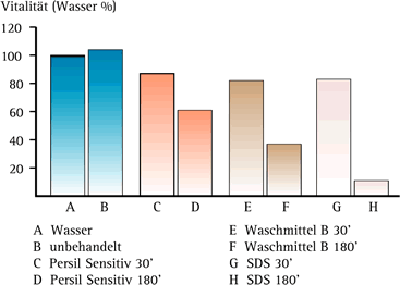Nach einer einmaligen Applikation des Waschmittels nahm die Vitalität der Zellen in Abhängigkeit von der Applikationszeit und von der eingesetzten Testkonzentration ab. Nach 180 Minuten Applikationszeit war die Reduktion der Zellvitalität bei Persil Sensitiv deutlich geringer im Vergleich zu Waschmittel B. Dieses Ergebnis korrelierte mit der Bestimmung der Menge des ausgeschütteten Entzündungsmediators Interleukin 1alpha. Nach Applikation von Waschmittel B wurden höhere Mengen bestimmt im Vergleich zu Persil Sensitiv (Abbildung 4a Vitalität und 4b IL-1alpha Ausschüttung). Unter diesen in vitro-Testbedingungen konnte gezeigt werden, daß Persil Sensitiv eine geringere Beeinflussung der Zellen induzierte im Vergleich zu Waschmittel B.