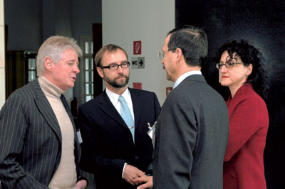 Formulation experts in discussion: Dr. Holger Reimann (2nd from left), head of Pharmazeutische Laboratorium (Pharmaceutical Laboratory) of Neues Rezeptur- Formularium (NRF) (New Prescription Formulatory), Eschborn, informed about the prerequisites starting materials of dermatological formulations have to fulfill. Certified biologist Friederike Schüller (right) with company Caesar & Loretz GmbH, plant Bonn, presented the results of a ring study showing that the microbiological quality of formulations prepared in pharmacies is in general acceptable.