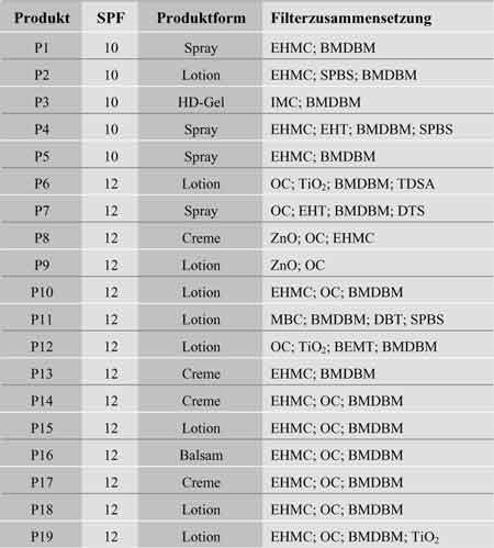 Es wurden 19 Sonnenschutzprodukte in Discountern, im Lebensmittelhandel und in Apotheken eingekauft. Die Produkte enthalten unterschiedliche UV-Filtersysteme mit SPF 10-12. Die Mehrheit der Produkte lobt auf den Packungen breitbandigen Schutz gemäß der Australischen Norm AS 2604 auf. Lediglich bei zwei Produkten wird ein UVA-/UVB-Langzeitschutz allerdings ohne Verweis auf die Australische Norm ausgewiesen. Die Angaben zum SPF, zur Produktform sowie zu den enthaltenen UV-Filtern sind in Tabelle 1 aufgeführt.