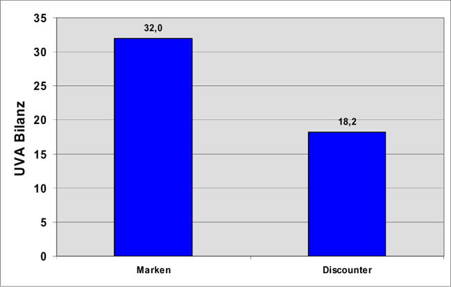 Um den Vergleich zwischen den beiden Herstellerkategorien auf eine breitere Basis zustellen, wurde die Anzahl der Produkte, die von Discountern und Drogeriemärkten als günstige Eigenmarken angeboten werden, auf insgesamt zwölf Muster ausgedehnt. Dabei bestätigte sich, dass diese allesamt nur UVA-Schutz im unteren Bereich gewähren. Die Unterschiede zu den Produkten von forschungsaktiven Markenherstellern haben sich im Vergleich zum Vorjahr sogar noch verstärkt. In Abbildung 2 sind die Mittelwerte der ermittelten UVA-Bilanz für beide Produktgruppen gegenübergestellt. Demnach bieten die traditionellen Marken dem Verbraucher deutlich leistungsfähigere Produkte an. Der UVA-Schutz liegt im Mittel um ca. 75 % (!!) über den Schutzleistungen der Billiganbieter.