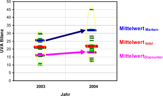 Abbildung 3: Vergleich des ermittelten Bereichs des UVA-Schutzes bei der Studie 2003 und der aktuellen Studie im Jahr 2004.
