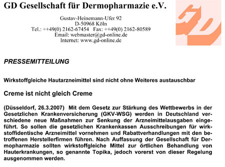 Auszug aus einer Pressemitteilung, mit der die Gesellschaft für Dermopharmazie anlässlich ihrer 11. Jahrestagung Ende März 2007 in Düsseldorf auf die Probleme der Substitution wirkstoffidentischer Topika hingewiesen hat. Der Volltext der Pressemitteilung steht hier zur Verfügung: ...