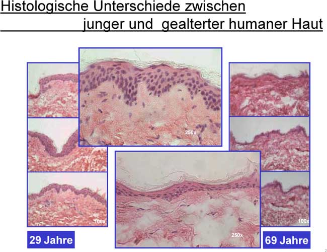 Histologische Untersuchungen zeigen, dass sich diese äußerlich sichtbaren Hautveränderungen im Hautgewebe widerspiegeln. Jugendliche Haut weist eine typische papilläre Struktur in der Grenzschicht zwischen Epidermis und Dermis auf. Die Epidermis ist hier zellreich und dick, während die Dermis dichte Ablagerungen von extrazellulärem Matrixmaterial aufweist und sehr regelmäßig aufgebaut ist. Gealterte Haut hingegen zeigt eine flache, wenig papilläre Struktur in der Grenzschicht zwischen Dermis und Epidermis. Darüber hinaus ist die Epidermis hier zellarm und dünn. Die Dermis besitzt wenig extrazelluläres Matrixmaterial (zum Beispiel Kollagen) und wirkt dadurch aufgelockert und wenig gleichmäßig (Abbildung 2).