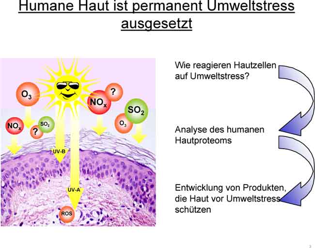 Auslöser der extrinsischen Hautalterung sind neben den UV-Strahlen des Sonnenlichts auch Ozon, Stickoxide und Schwefeldioxide (Abbildung 3). Die Frage, wie genau Hautzellen auf diese Umwelteinflüsse reagieren und welche molekularen Mechanismen der zellulären Antwort zu Grunde liegen, ist bisher erst teilweise beantwortet [5]. Neue Erkenntnisse über die biochemischen Abläufe in unterschiedlichen Zellen und Geweben können mit modernen Methoden wie der vergleichenden Proteomanalyse gewonnen werden.