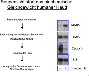 Weiterhin konnte weiterhin gezeigt werden, dass Ganzhautmodelle auf Umweltstress wie Sonnenlicht gleichermaßen physiologisch reagieren wie humane Haut. Dazu wurden Ganzhautmodelle mit einem Sonnenlichtsimulator (Sol 500, Firma Hoehnle) gestresst und analysiert. 48 Stunden nach der Bestrahlung wurde die RNA der Hautmodelle präpariert und mittels Northern-Blot-Technologie analysiert (Abbildung 5). Die Ergebnisse belegen, dass es durch Sonnenlicht - wie in der In-vivo-Situation - zu einer verstärkten Produktion des Kollagen abbauenden Enzyms Matrix-Metallo-Protease 1 (MMP 1) kommt [8], während der Inhibitor von MMP 1, Tissue Inhibitor of Metallo Protease 1 (TIMP 1), nicht wesentlich reguliert wird. Gleichzeitig vermindert sich die Genaktivität für Kollagen 1-Typ 1 [8, 9].