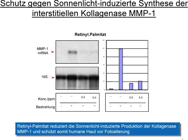 Diese Reaktionen sind kausal mit dem Phänomen der photogealterten Haut verbunden, bei der typischerweise die Gesamtkollagenmenge abnimmt. Neben dieser hauttypischen Stressantwort ist das Hautmodell ebenso in der Lage, auf Bioaktivstoffe physiologisch zu reagieren. So konnte zum Beispiel gezeigt werden, dass der Vitamin A-Ester Retinylpalmitat die durch Sonnenlichtbestrahlung erhöhte Synthese von MMP 1 um rund 80 Prozent reduziert und damit die Haut vor dem Phänomen der Photoalterung schützt (Abbildung 6).