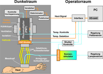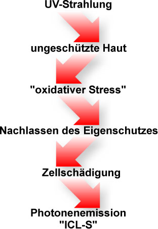 Autorenbeitrag A. Schrader*, S. Benard und M. Rohr Rationale und Praxis der Biophotonik * Institut Dr. Schrader - Creachem GmbH, Holzminden Vortrag anlässlich des GD-Symposiums "Wirkungen von Dermokosmetika" in Düsseldorf am 17. Oktober 2001 Synopsis Der Schutz der menschlichen Haut vor negativen Auswirkungen der Sonnenstrahlen bleibt bis heute eine Herausforderung für die pharmazeutische und kosmetische Industrie. Deshalb sind neue Strategien zur Testung der Schutzleistung kosmetischer Formulierungen von größtem Interesse. Ziel dieser Arbeit ist die in vivo Bestimmung der UVA-Schutzleistung chemischer Filter und Antioxidantien in komplexen Formulierungen mittels ICL-S (Induced Chemiluminescence of Human Skin). Diese Methode realisiert die unmittelbare Umsetzung von Prinzipien der Biophotonikforschung in die Praxis und ermöglicht, unter Ausnutzung der Photonenemission der menschlichen Haut, eine in vivo Quantifizierung der Belastung unmittelbar nach Sonnenexposition. UVA-Strahlung (320 - 400 nm) führt zu einer verstärkten Bildung freier Radikale und reaktiver Sauerstoffverbindungen in den Zellen. Dieser "oxidative Stress" kann elementare Bausteine der Zellen wie DNA, Proteine und Lipide schädigen und zu vorzeitiger Hautalterung (sun aging) und Hautkrebs führen. Ein Teil der Energie dieser exergon ablaufenden Reaktionen wird in Form von Photonen freigesetzt. Diese UV-induzierte aber chemisch generierte Photonenemission (Chemolumineszenz) korreliert mit dem Ausmaß der Schädigung und verbindet damit einen realitätsnahen stress-inducer (UVA-Strahlung) mit biochemischen und biophysikalischen Auswirkungen auf Zellniveau. Durch hochempfindliche Photomultiplier und die single-photon-counting Technik wird die messtechnische Erfassung der ICL-S realisiert. Die in Probandenstudien ermittelten Werte zeigen eine Reduktion der Photonenemission von bis zu 70 % bei einer eingesetzten Konzentration chemischer UVA-Filter von 2 % im Vergleich zur unbehandelten Haut. Die Wirksamkeit der eingesetzten Antioxidantien zeigt sich in einer Verminderung der Photonenemission von nahezu 20 % nach zweiwöchiger regelmäßiger Produktapplikation im Vergleich zum Ausgangswert. Einleitung Seit jeher übt das enzymkatalysierte Organismenleuchten (Biolumineszenz) oder das Himmelsschauspiel der Aurora borealis (Chemolumineszenz) auf den Menschen eine magische Faszination aus. Die rationale und wissenschaftlich korrekte Herangehensweise an Photonenemissionsvorgänge mit Hilfe hochempfindlicher Photomultiplier eröffnet jedoch nicht minder faszinierende Aussichten. Die Biophotonik wird selbst in den Handlungsempfehlungen der Agenda der Bundesregierung "Optische Technologien für das 21. Jahrhundert" als prioritäres Themenfeld herausgestellt. Ultraviolette Strahlung sowie kurzwellige, sichtbare Strahlung rufen nach Einwirkung auf Oberflächenareale lebender Organismen zeitverzögert ein Chemolumineszenzsignal hervor [1, 2]. Die Natur so gearteter photoinduzierter Emissionen ist bis zum heutigen Tag Gegenstand der Forschung. Die genaue Äthiologie der gemessenen Chemolumineszenz ist für ein komplexes Organ wie die Haut schwer zu ermitteln. Es wird vielmehr der Endpunkt einer Kaskade von Reaktionen gemessen, die durch mehrere Emissionsprozesse und Absorptionsprozesse charakterisiert sind. Eine Beeinflussung der gemessenen Signale ist dagegen gut durchführbar. Vor allem nach UVA-Bestrahlung wird in Zellen ein oxidativer Stress erzeugt der das steady state Gleichgewicht (oxidative Homöostase) zwischen oxidativen Prozessen und Systemen des anti-oxidativen Schutzes empfindlich stört [3]. Durch die vermehrte Bildung von freien Radikalen und reaktiven Sauerstoffverbindungen (ROS), vor allem von Superoxidanionradikalen (O2-) und Wasserstoffperoxid (H2O2) werden elementare Zellbausteine verändert und dadurch in ihrer Funktion gestört. Von O2- und H2O2 leiten sich zusammen mit Metallionen, Peroxidasen oder Stickstoffmonoxid weitere reaktive Spezies ab. Ein besonders ausgeprägtes gewebeschädigendes Potential weisen Hydroxyl-Radikale (OH), Peroxynitrit, Singulett-Sauerstoff, Hypochlorsäure und der Komplex I von Peroxidasen auf. Die Absorption der Strahlung durch biologisch relevante Moleküle, wie z.B. Hämverbindungen, Flavine ist dabei das auslösende Primärereignis. Nach Initiierung dieser primären oxidativen Prozesse werden vor allem Reaktionen von ROS mit ungesättigten Fettsäuren, Kernsäuren und Proteinen beschrieben. Die Häufigkeit der chronischen Strahlungsschäden der Haut hat in den letzten Jahren massiv zugenommen. Neben der akuten Schädigung der Haut durch den Sonnenbrand für den vor allem der UVB-Anteil des Sonnenspektrums verantwortlich ist, wird die UVA-Strahlung (320 - 400 nm) für Langzeitschäden, wie vorzeitige Hautalterung (sun-aging), Immunsuppression und Hautkrebs verantwortlich gemacht [4]. Durch UVB-Filter in kosmetischen Formulierungen wird das Frühwarnsignal der Haut (der Sonnenbrand) nicht oder erst nach längeren Bestrahlungszeiten aktiv und damit die UVA-Exposition der Haut noch verstärkt. Damit wird die UVA-Strahlung mit zu einem dominierenden Stressfaktor der Haut, vor allem nach ausgiebiger Sonnenexposition. Um eine optimale Wirkung eines Sonnenschutzproduktes zu erreichen, sollten die negativen Auswirkungen vor denen eine Wirksubstanz die Haut schützen soll, möglichst umfassend quantitativ in vivo beschrieben werden. Eine in vivo Detektion der emittierten Photonen gewährleistet die Verknüpfung eines realitätsnahen stress-inducers (UVA Strahlung) mit einer umfassenden Zellantwort und bildet somit die Basis für eine optimierte Produktentwicklung.
