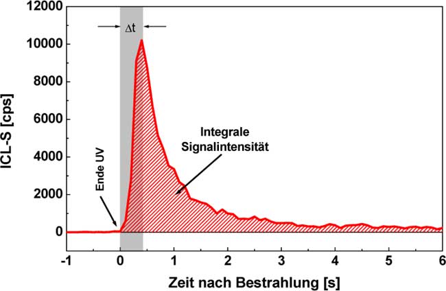 Werden die integralen Zählraten des Leerfeldes zu den Produktfeldern ins Verhältnis gesetzt, erhält man Größen-unabhängige Quotienten von 3 bzw. 2 für die Rezepturen UVB1 und UVB2 sowie einen Wert von 14 für die Rezepturen UVB1+UVA1 und UVB2+UVA1. Die Werte für das mit Placebo behandelte Hautareal liegen in der gleichen Größenordnung (ca. 2.5) wie die Messwerte der mit UVB-Filter behandelten Hautflächen. Die in vivo erzielten Resultate zeigen, dass mittels ICL-S unabhängig von den aktuellen UVB-Schutzeigenschaften eines Produktes dessen UVA-Schutz bestimmt werden kann. Zur Verifizierung dieses Ergebnisses wird eine Konzentrationsreihe eines weiteren Filters mit guten UVA-Absorptionseigenschaften getestet. Auf drei Testarealen werden 0.5, 1.0 und 2.0 % von UVA2 eingesetzt. Auf drei weiteren Testarealen werden diesen Formulierungen noch chemische UVB-Filter zugesetzt (vgl. Tab. 1). Um den Einfluss der reinen Grundlage auf die gemessenen Signalintensitäten zu testen kommt zusätzlich ein Placebo ohne jeglichen Filter zum Einsatz. Abb. 5 zeigt die Abklingkinetiken unmittelbar nach UVA-Bestrahlung der Haut in doppelt logarithmischer Darstellung. Es ist zu erkennen, dass das unbehandelte Messareal die höchsten Signalintensitäten zeigt. Weiterhin ist eine kontinuierliche Abnahme der Signalintensitäten mit Erhöhung der UVA-Filterkonzentration offensichtlich. Schon 100 s nach Applikation der UV-Noxe ist der Grundpegel des gemessenen ICL-S-Signals wieder erreicht.