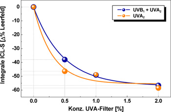 Eine Normierung der Werte auf Leerfeld und Placebo ergibt eine Abnahme der integralen ICL-S von ca. 60 % ungeachtet der Tatsache eines zusätzlichen UVB-Schutzes von SPF 7 im Vergleichsprodukt (vgl. Abb. 6).