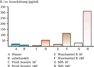 Durch Auswahl der geeigneten Testkonzentration, die im allgemeinen höher im Vergleich zur normalen Anwendung gewählt wird, werden auf diese Weise leichte Hautirritationen erzeugt. Der Grad der Reaktionen als Maß für die Hautverträglichkeit wird im Vergleich der Testsubstanzen untereinander bewertet. Die unter diesen Testbedingungen induzierten Hautreaktionen von Persil Sensitiv im Vergleich zu herkömmlichen Produkten wurden graphisch dargestellt (Abbildung 2). Bei wiederholtem Kontakt mit Waschlaugen können sich die leichten, für das Auge meist nicht sofort sichtbaren Irritationen addieren und nach einiger Zeit zu einer Hauschädigung führen.
